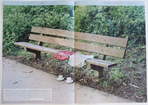 Even een paar minuten uit de hecktiek van de dag stappen en een klein beetje tijd voor elkaar maken. Gewoon samen een kopje thee drinken in het bos. Een bewijs van ware liefde en romantiek. De twee plastic zakjes onthullen dat zelfs aan de mogelijkheid dat het bankje nat kon zijn werd gedacht. Het stel is na afloop trouwens wel vergeten de boel op te ruimen. Gelukkig maar, want zo ontstaat er een werk van het Amsterdamse fototalent Annegien van Doorn. Met haar project “Quiet Afternoon” weet je nooit wat nou precies werkelijkheid of fictie is. En om eerlijk te zijn wil ik dat bij zo’n beeld ook helemaal niet weten. Het is mooi zo.